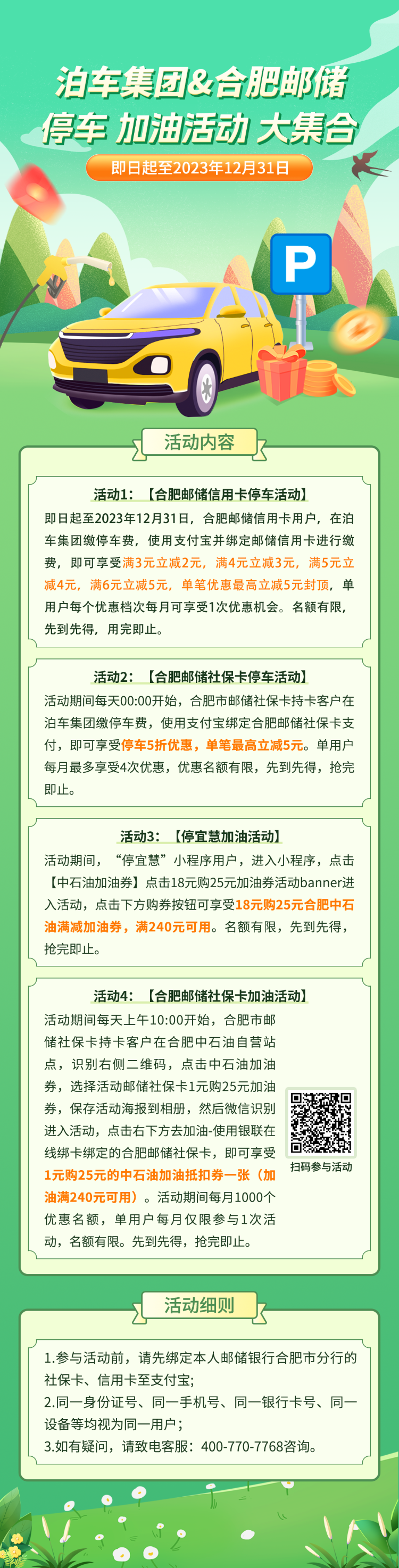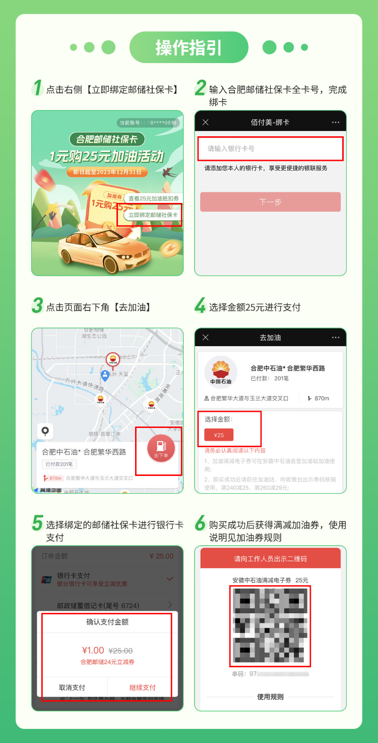 此外,对于合肥邮储银行社保卡持卡用户,在泊车集团运营的路边停车泊位停车缴费时,使用支付宝选择邮储社保卡支付,即可享受停车5折优惠,单笔最高立减5元。每人每月最多享有4次机会,优惠名额有限,先到先得,抢完即止。
