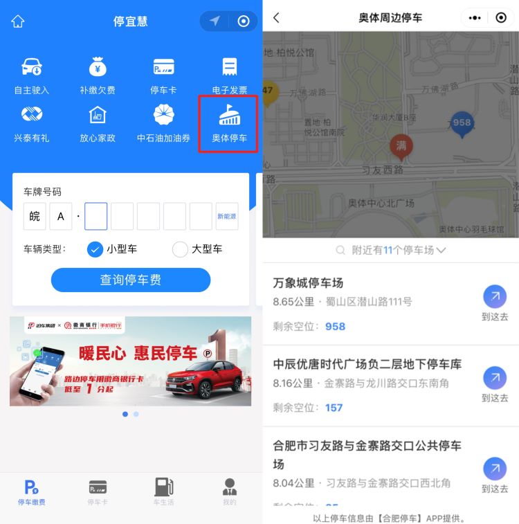 体育中心作为合肥市大型场馆,承接着各类文艺演出、体育赛事等事项,一遇到演出活动,人满为患,车流量激增,找车位如同开“盲盒”,常常一“位”难求。为提高市民出行效率,泊车集团旗下“停宜慧”小程序新增找车位功能。市民只需在出发前登录“停宜慧”小程序,进入“奥体停车”版块,即可查看体育中心周边的停车场信息:包括停车场数量、距离停车场路程、剩余泊位数以及收费标准等,点击“到这去”一键导航至目的地停车场。